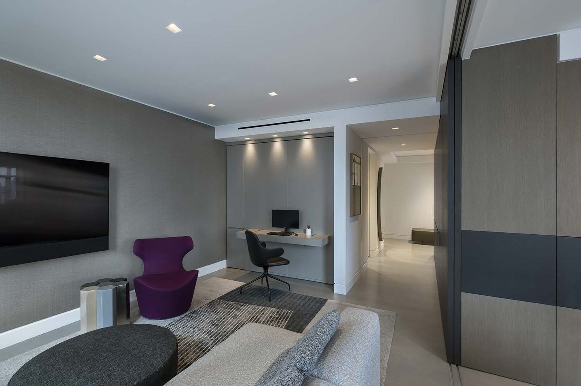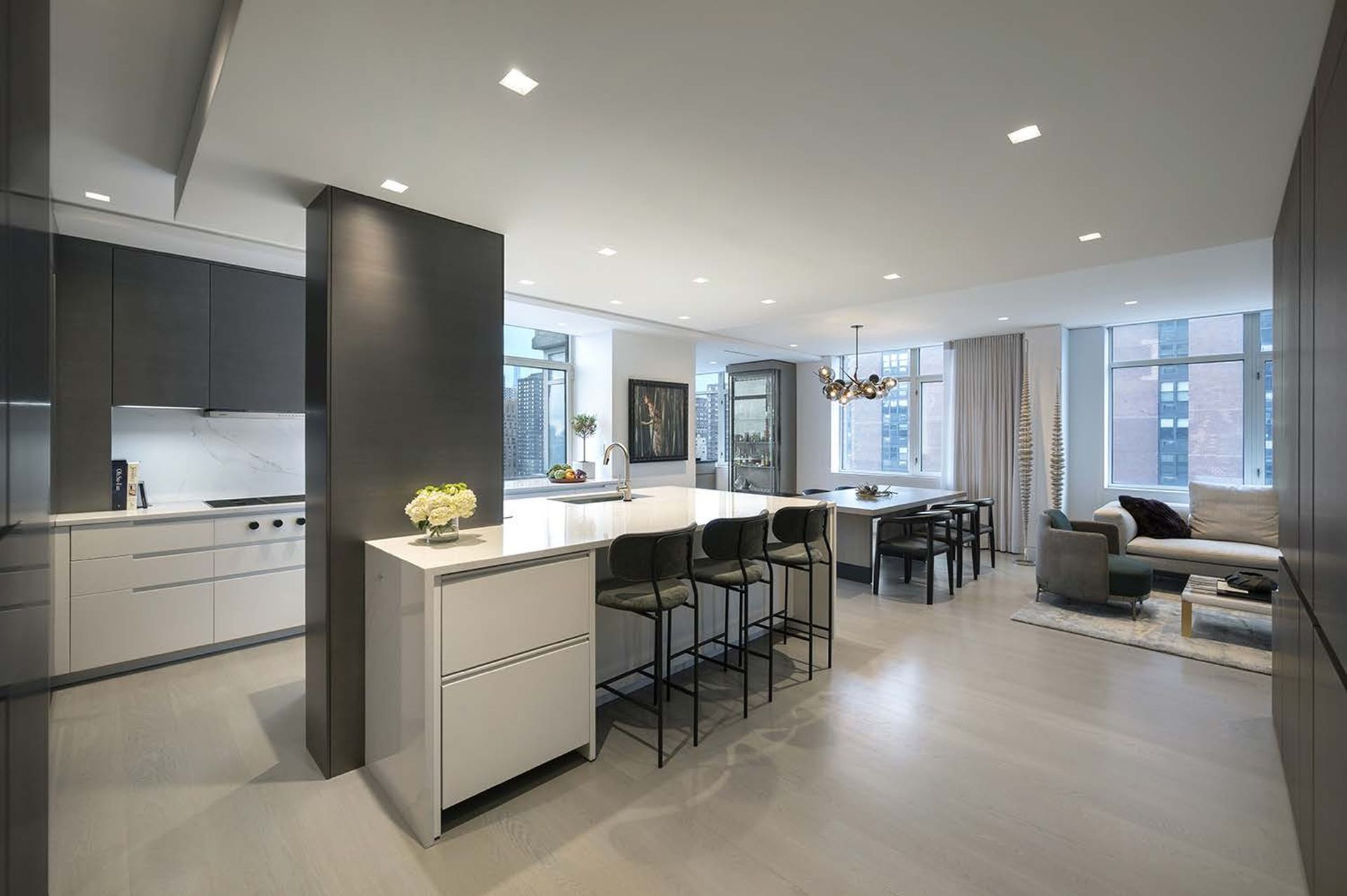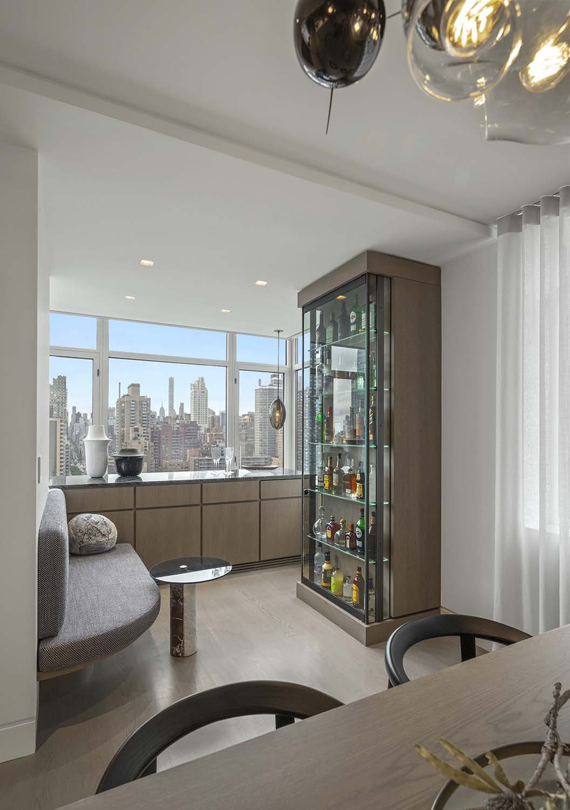 This two Bedroom converts into a 3 Bedroom when the movable Den wall panels are closed and the Office desk is nestled away utilizing creative Millwork design. This apartment transformed into a sleek but warm home for the Client and their college graduates.