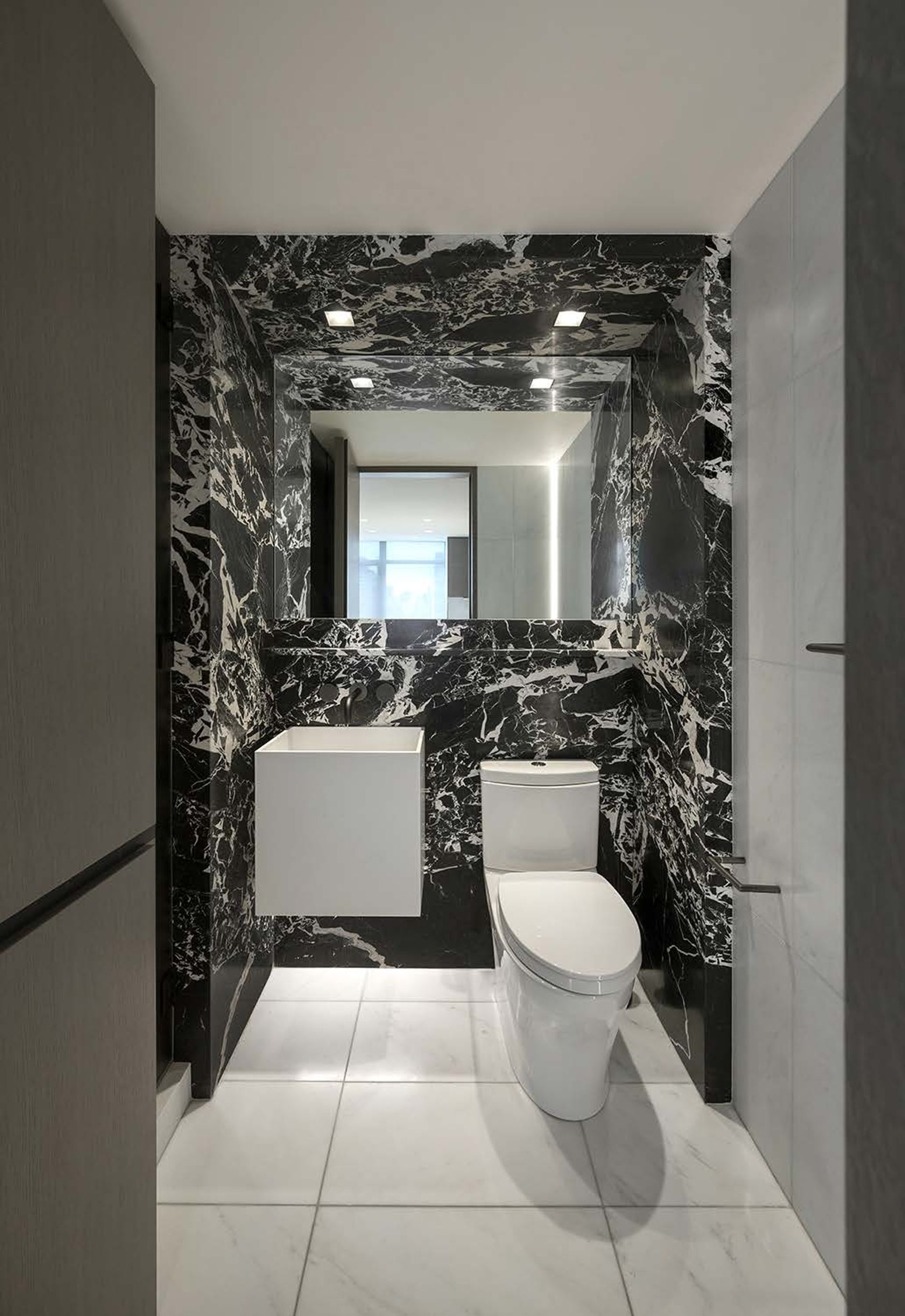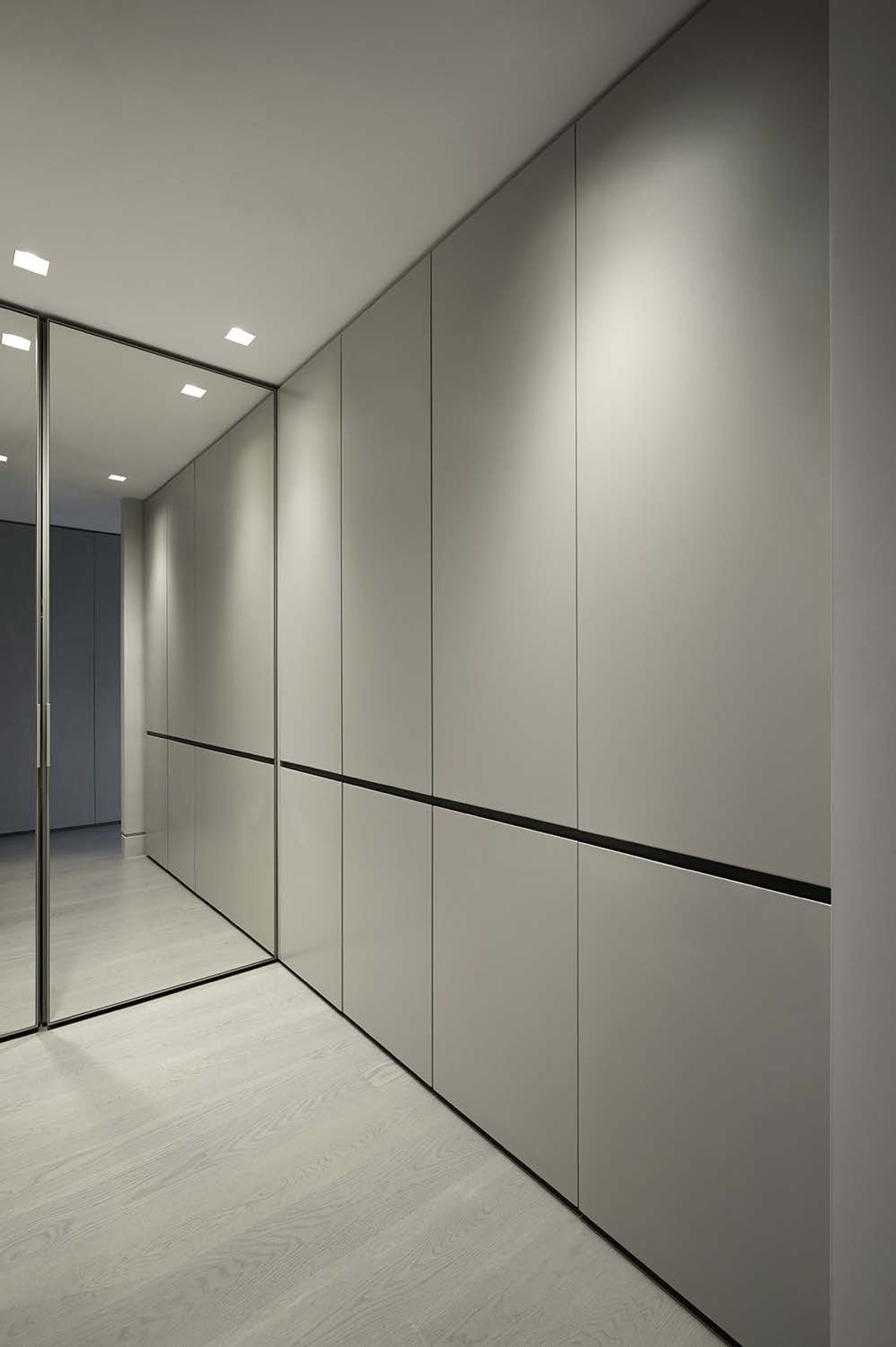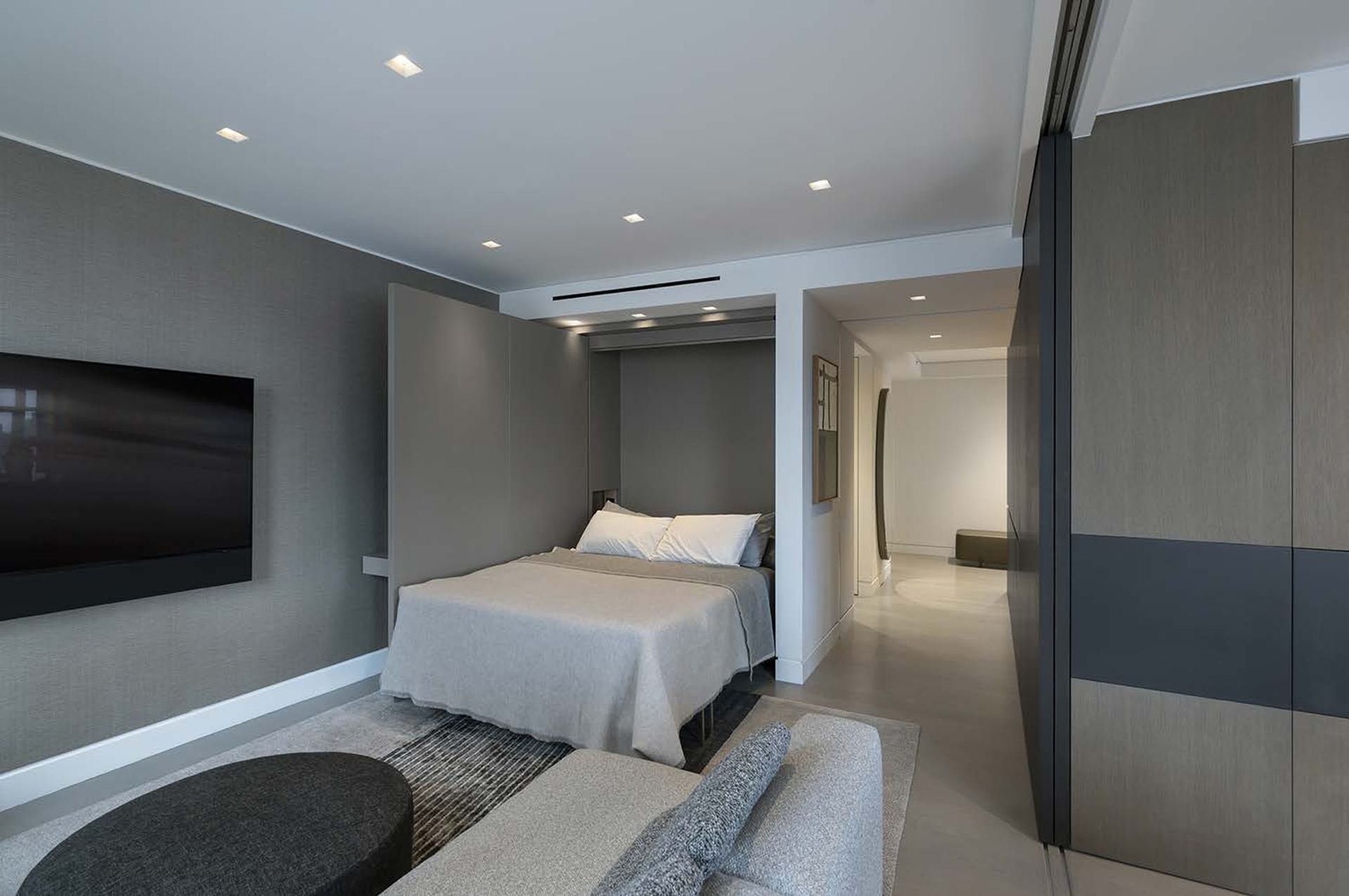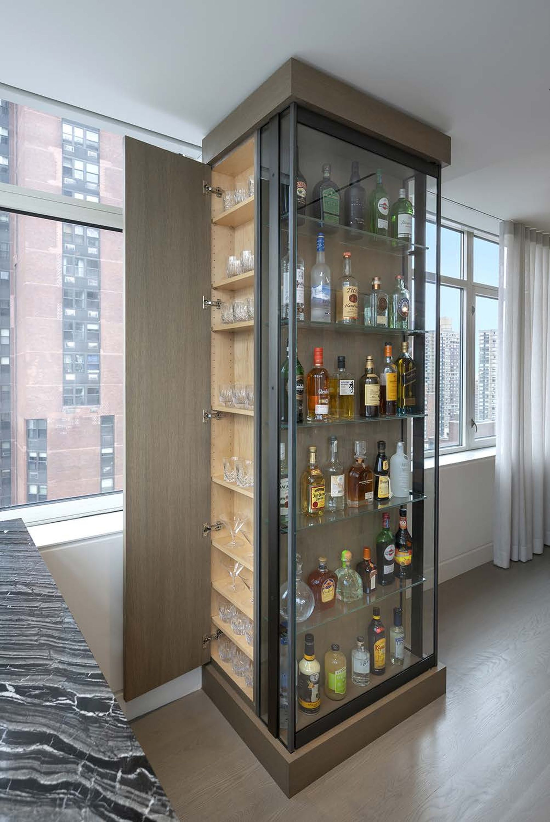 This two Bedroom converts into a 3 Bedroom when the movable Den wall panels are closed and the Office desk is nestled away utilizing creative Millwork design. This apartment transformed into a sleek but warm home for the Client and their college graduates.