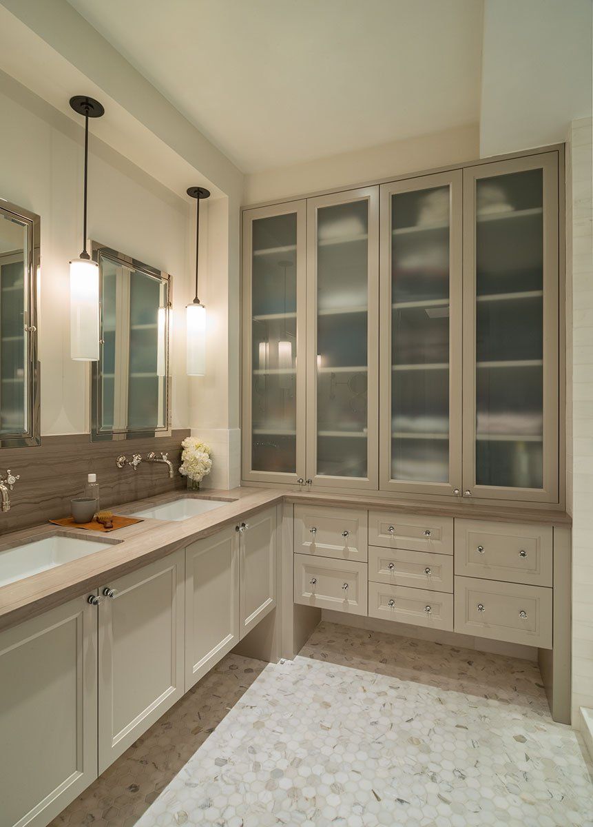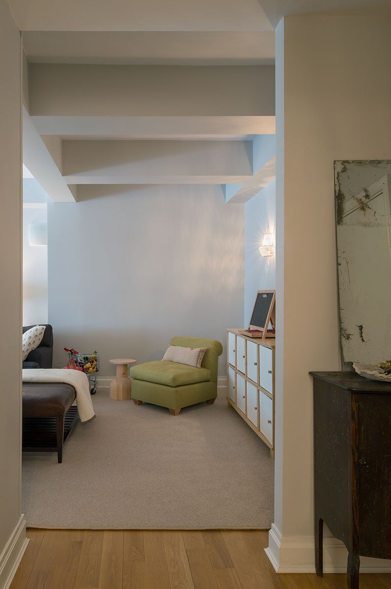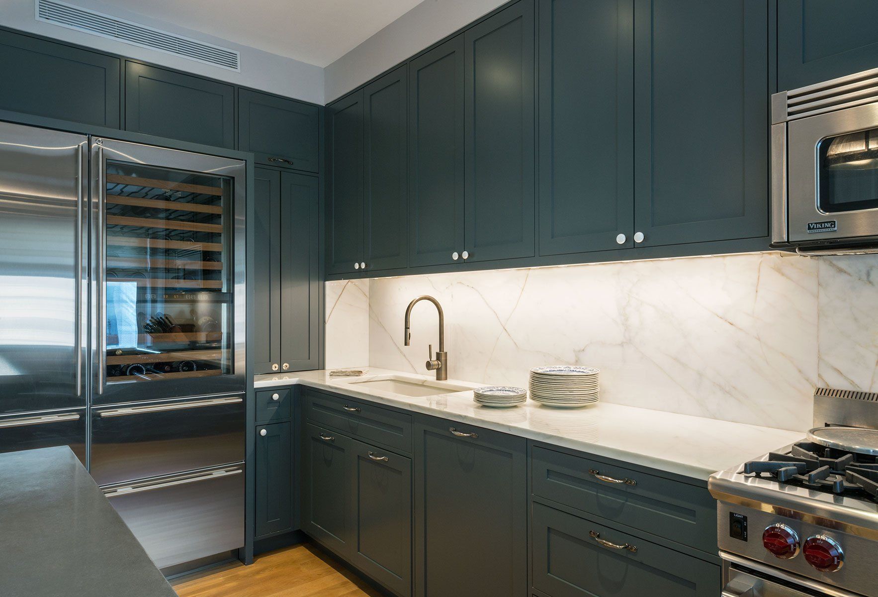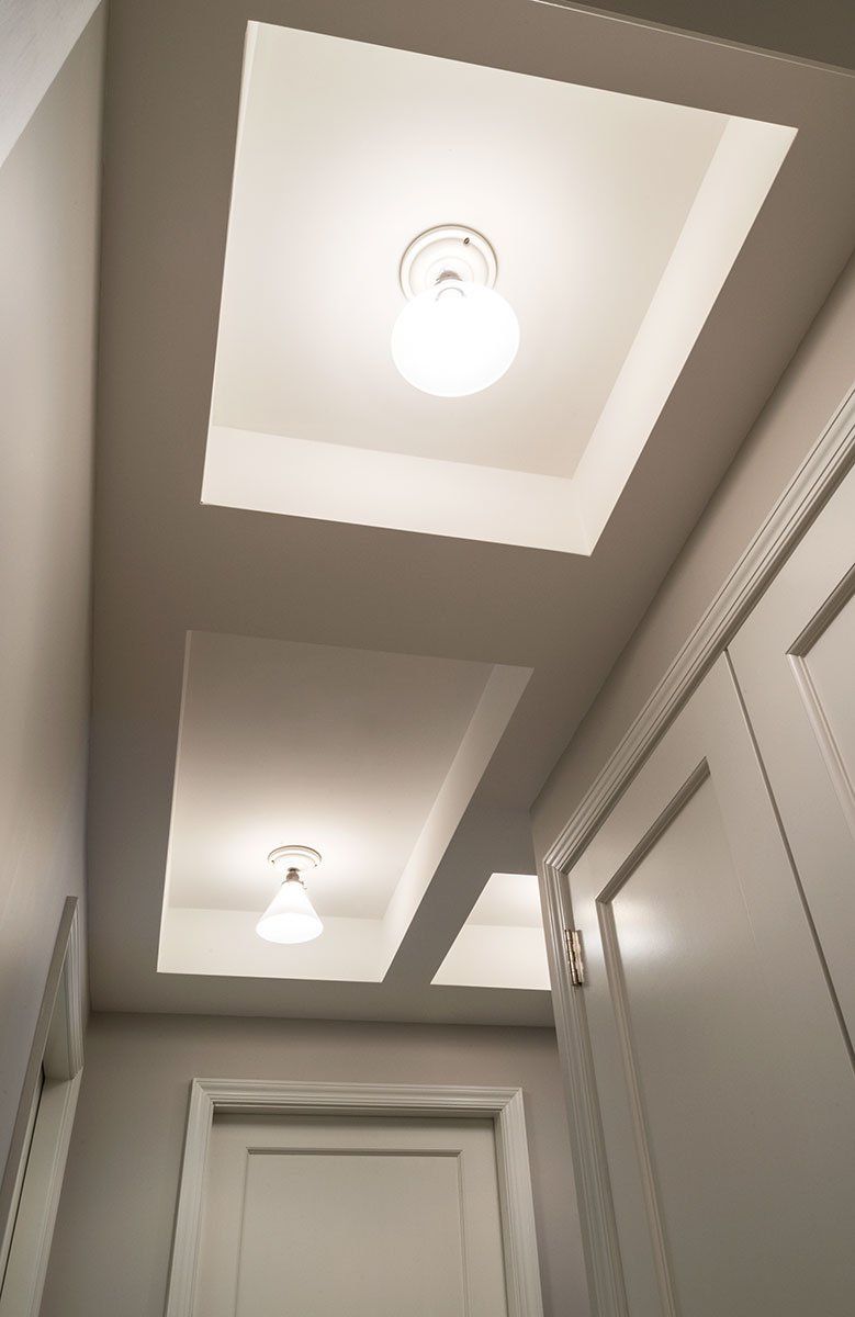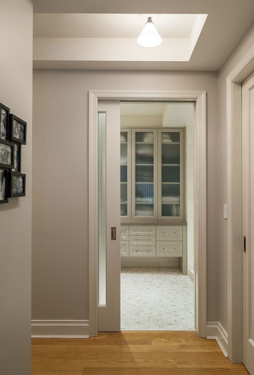 This gut renovation reorganized spaces to create better adjacencies and flow. The kitchen was relocated into the area of the former dining room, creating a connection to the living room. Existing guest and master bathrooms were redesigned. Millwork and finishes mixed warm and cool materials, including ceramic tile, painted wood, stone, and concrete. The solution relates clean lines to a traditional vocabulary within a cohesive aesthetic.